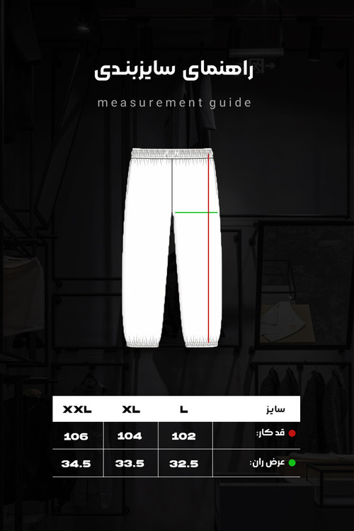 ابعاد: ( عدد بزرگ طول شلوار و عدد کوچک عرض ران) لارج 102-32.5 ایکس لارج 104-33.5 دو ایکس لارج 106-34.5